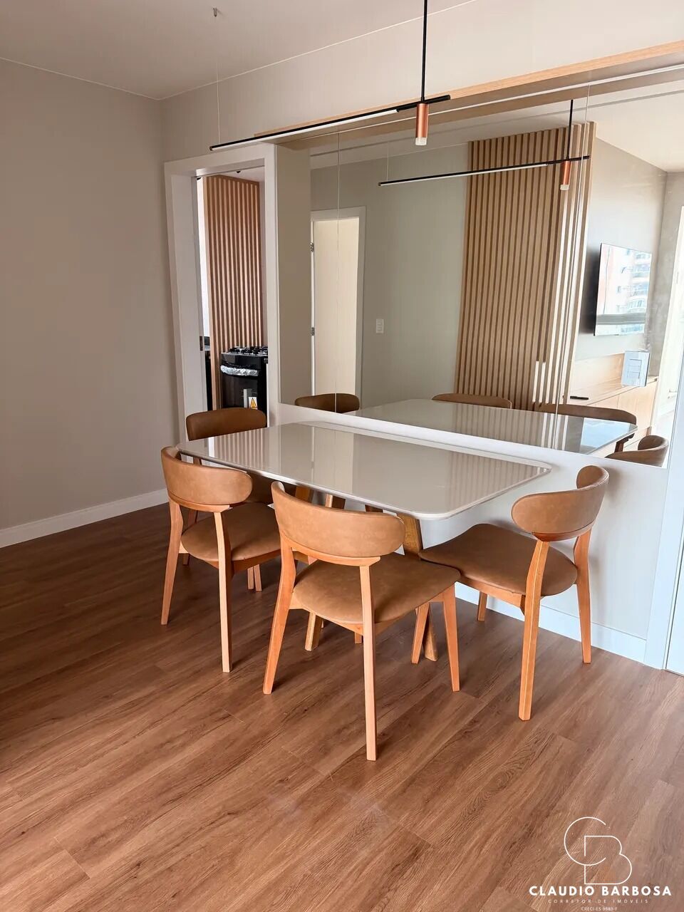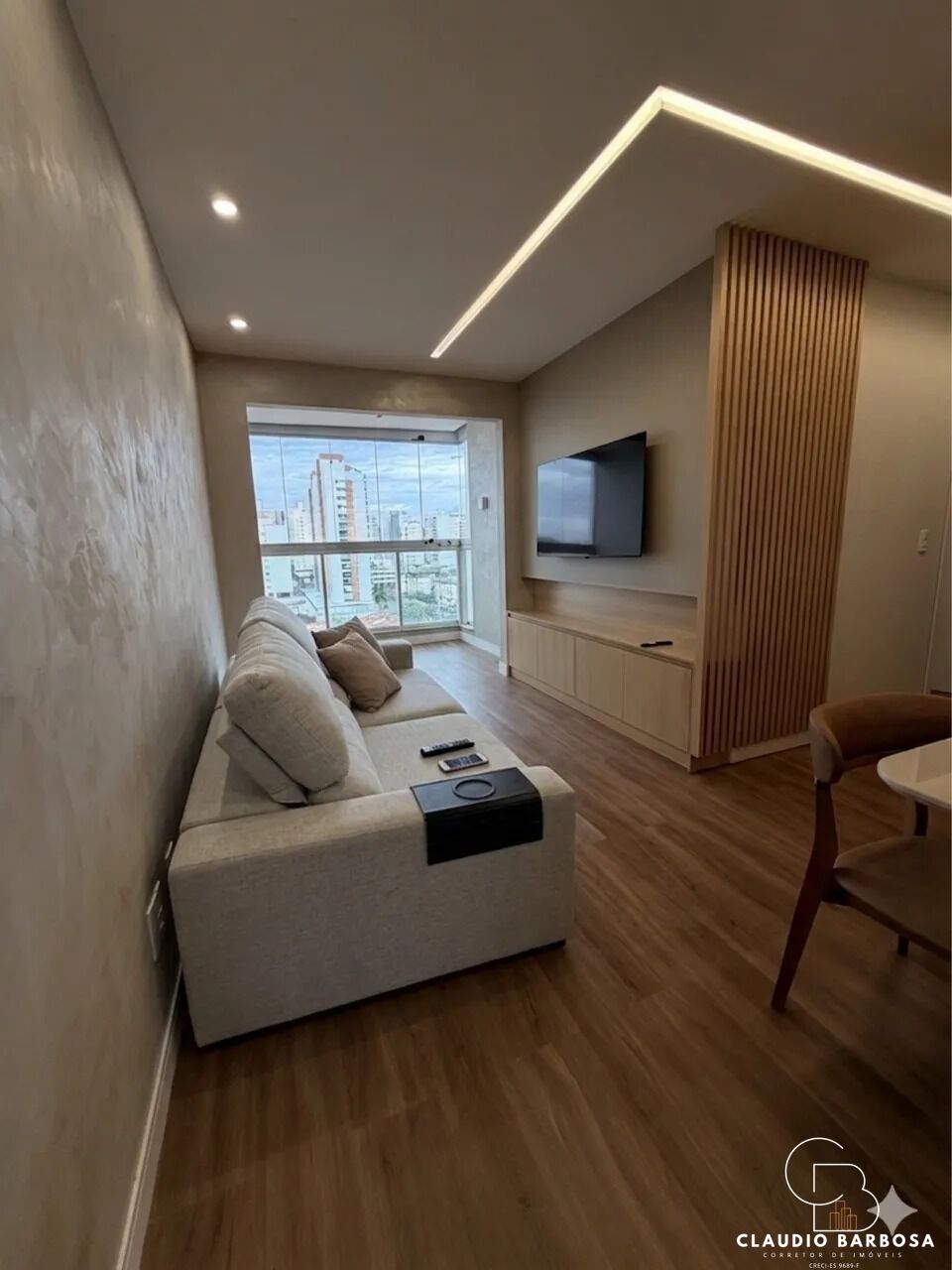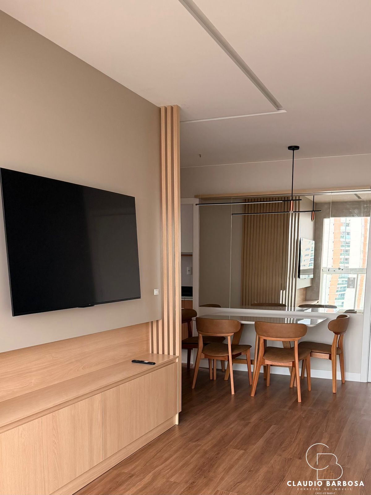 -Sala integrada, moderna e aconchegante, com sofá, mesa de jantar e TV 55?.